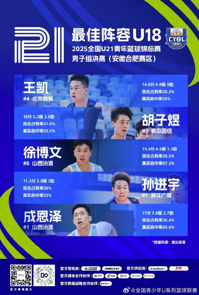 全国U21青年篮球锦标赛特设最佳阵容(U18) 出炉!