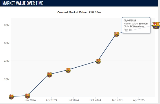 库巴西出自于巴萨青训,2023年从青年队进入巴萨一线队时,他的身价只有150万欧。但两年间他得到了长足的进步,展现了充分的潜力,身价已经暴涨到如今的8000万欧。