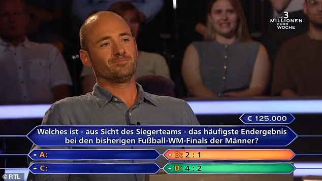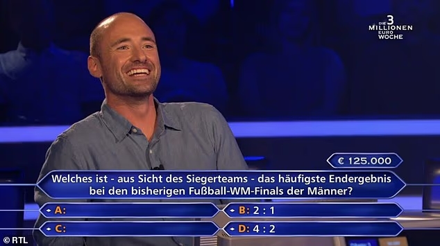 马克-奥芬巴赫尔在这档节目中一路过关斩将,将奖金积累到了可观的数额,这时主持人向他提出了新问题:“男足世界杯决赛中,出现最多的比分是多少?1-0?2-1?3-1?还是4-2?”