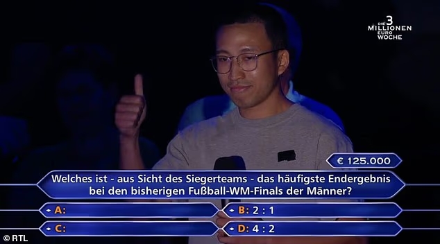 10月11日讯 在德国版的《谁想成为百万富翁》智力竞赛节目中,一位参赛者没能回答对世界杯决赛的比分,错失12.5万欧元(约103万人民币)奖金。