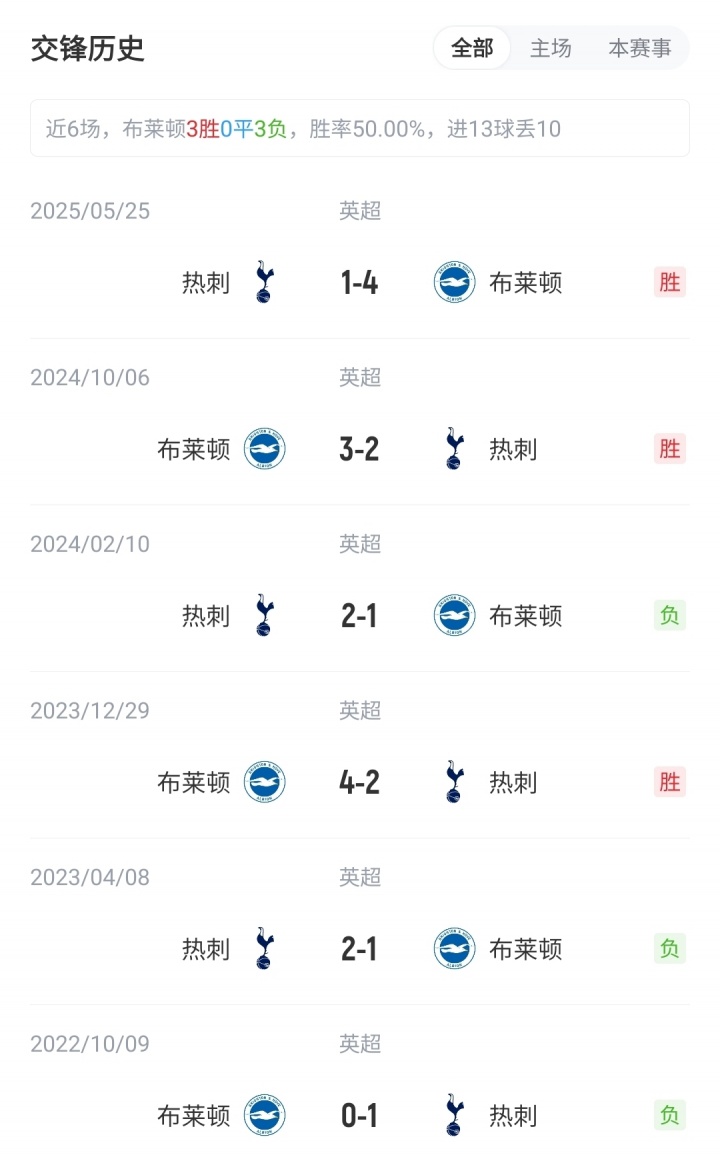 目前英超积分榜上,布莱顿1胜1平2负积4分,位列第13;热刺3胜1负积9分,位列第3。
